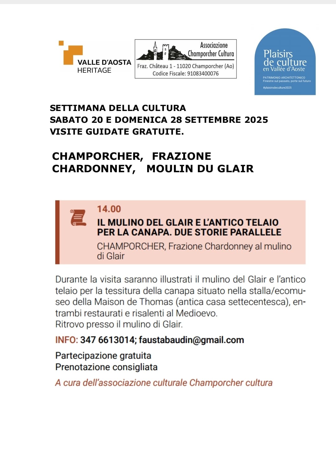 L'Associazione Champorcher Cultura organizza, nell'ambito dell'evento Plaisirs de culture en Vallée d'Aoste, due visite guidate dedicate al Mulino del Glair e all'Ecomuseo della Canapa. Un'occasione per conoscere l'antico mulino e l'altrettanto antico telaio custodito nell'Ecomuseo, scoprendo i segreti del loro funzionamento.