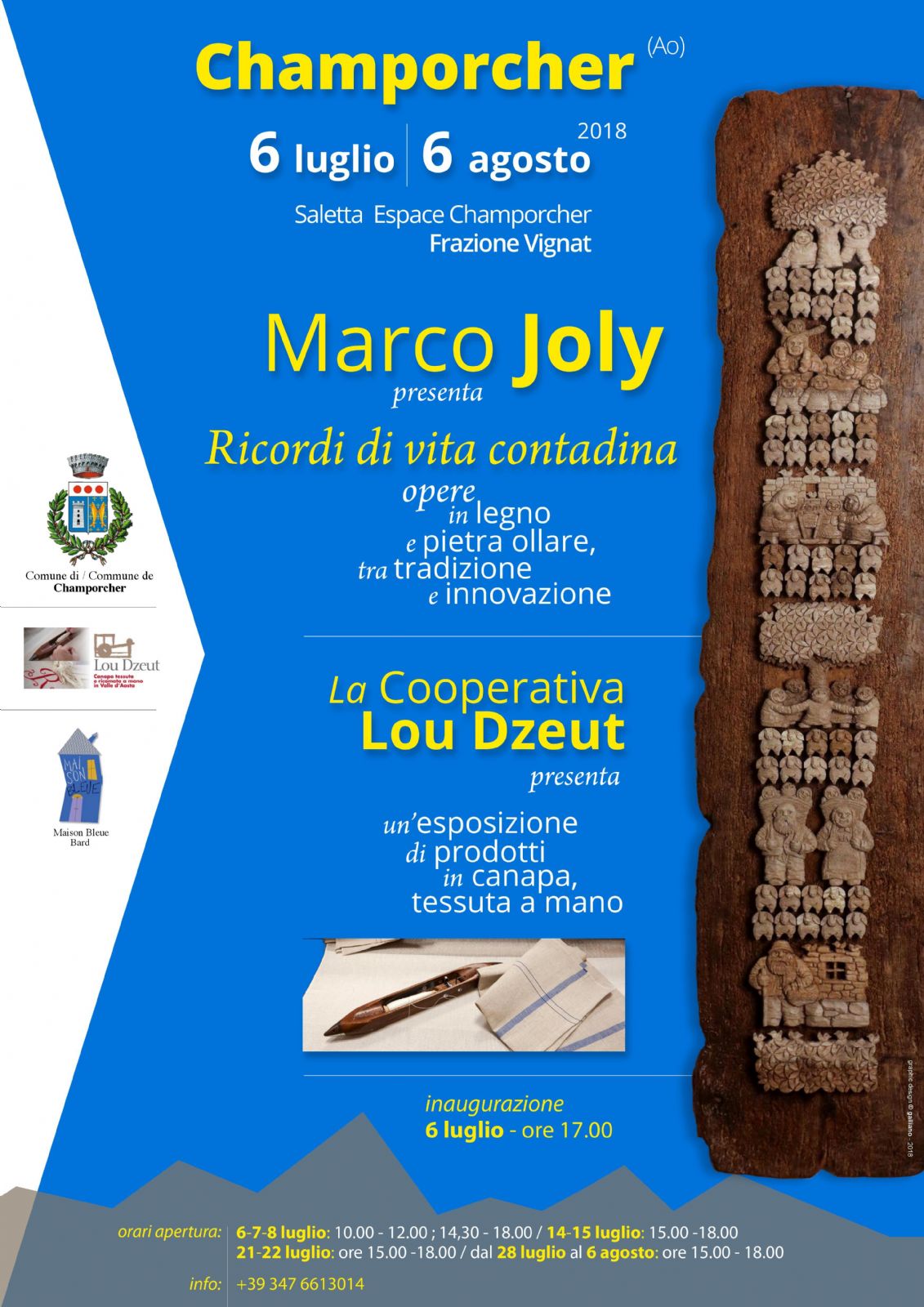 MARCO JOLY, uno dei più grandi scultori valdostani, espone le sue opere per la prima volta a Champorcher. Dal 6 luglio al 6 agosto. Insieme a lui, la Cooperativa Lou Dzeut propone una selezione dei suoi prodotti d'eccellenza, in canapa.