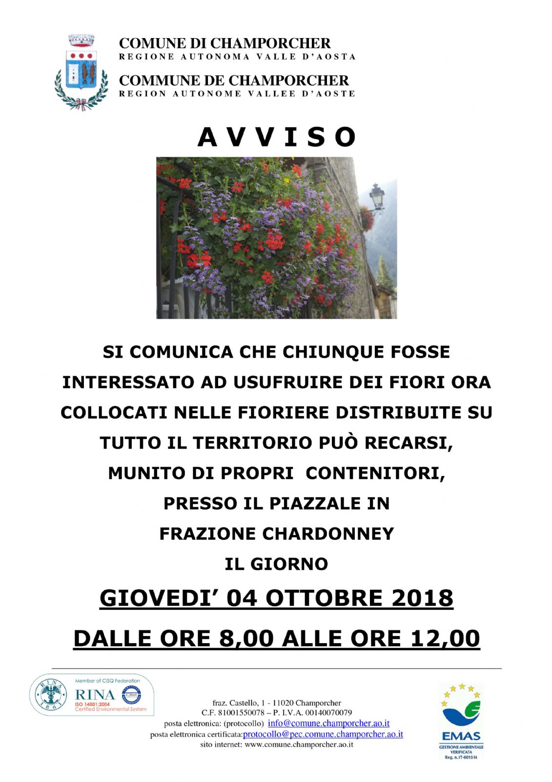 SI COMUNICA CHE CHIUNQUE FOSSE INTERESSATO AD USUFRUIRE DEI FIORI ORA COLLOCATI NELLE FIORIERE DISTRIBUITE SU TUTTO IL TERRITORIO PUÒ RECARSI, MUNITO DI PROPRI CONTENITORI, PRESSO IL PIAZZALE IN FRAZIONE CHARDONNEY IL GIORNO GIOVEDI’ 04 OTTOBRE 2018 DALLE ORE 8,00 ALLE ORE 12,00