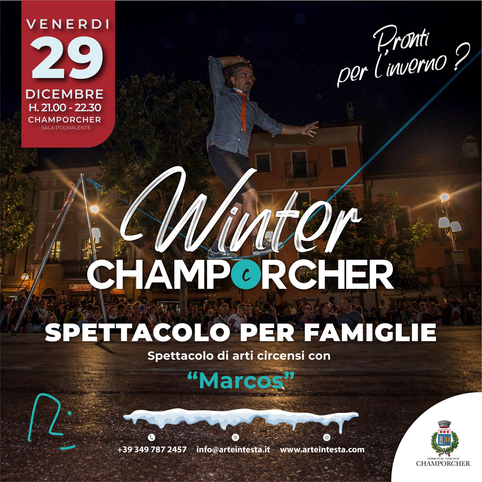 Dalle 21:00 alle 22:30, al salone polivalente in frazione Vignat, spettacolo di arti circensi per famiglie con "Marcos". 🤹♂🎪
