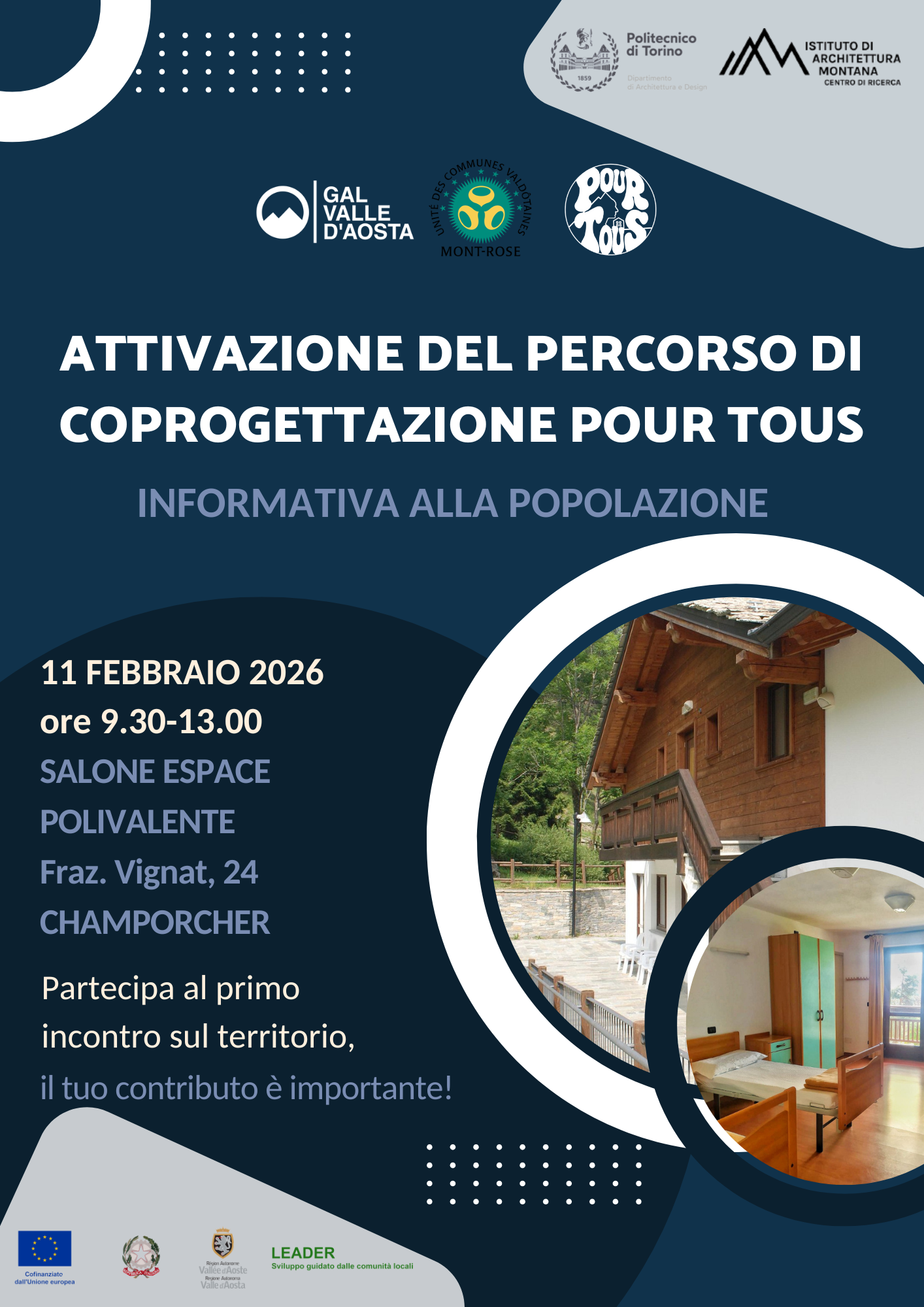 Nella mattinata di mercoledì 11 febbraio, dalle ore 9.30 alle ore 13.00, presso il Salone espace polivalente di Champorcher, avrà luogo il primo incontro sul territorio del percorso Pour Tous,  promosso dal GAL Valle d'Aosta.